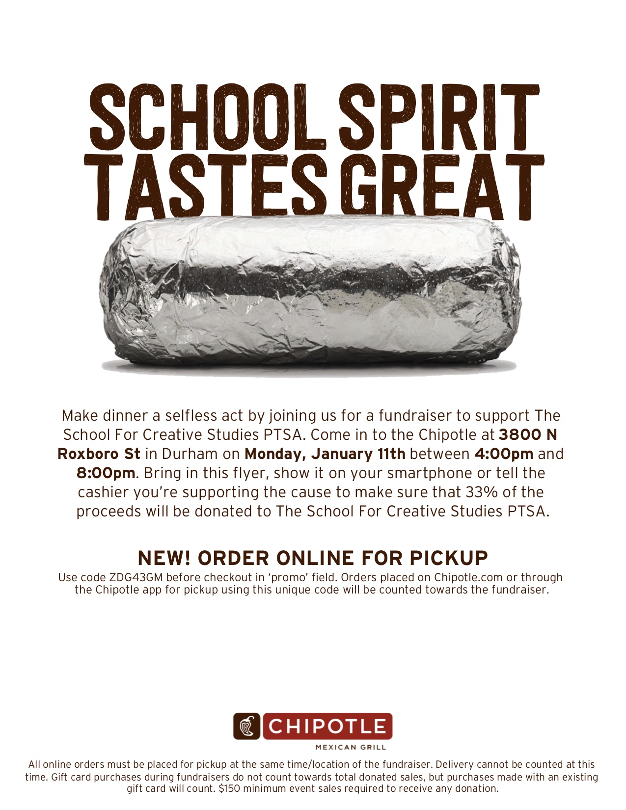 Join us for our upcoming PTSA Dine out Night—at Chipotle Roxboro Rd. next Monday, January 11 from 4:00 – 8:00 p.m. (See Price’s Write blog, Facebook/Instagram, and SCS Website for the flyer.)